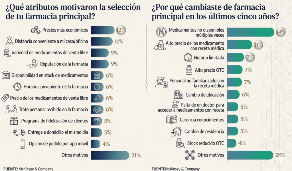 La lectura del mercado va más allá del auge digital. El estudio muestra que los consumidores siguen eligiendo su farmacia principal por factores tradicionales como precios más económicos (12%), cercanía al hogar o la oficina (11%) y variedad de medicamentos de venta libre (9%). Sin embargo, el avance del ecommerce se explica precisamente por su capacidad para responder a varios de esos atributos al mismo tiempo: conveniencia, acceso, entrega y mejor visibilidad de inventario.
